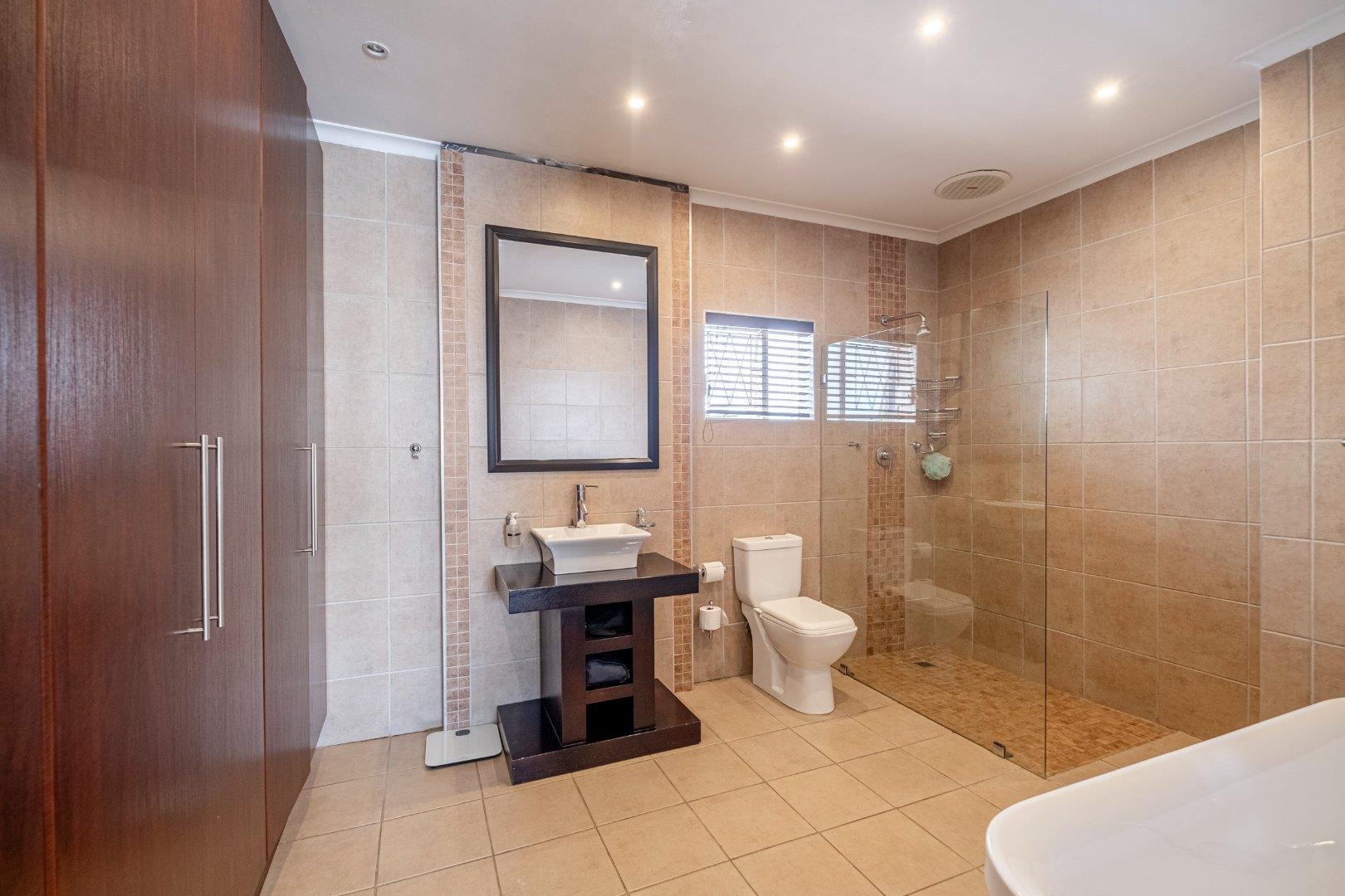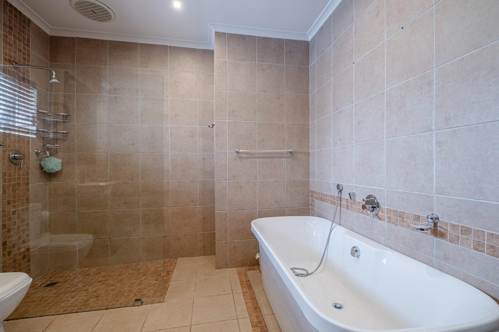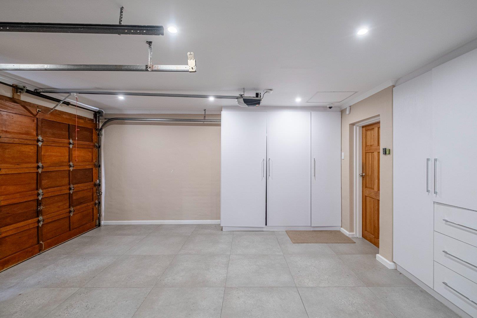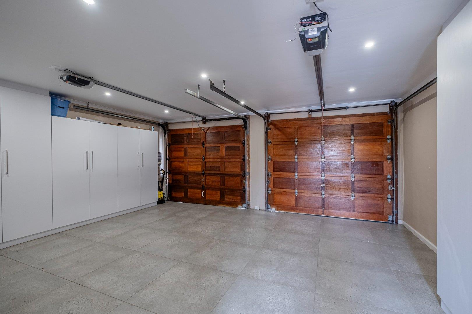 Large tiled double garage (55m2) with ample built-in cupboards, and separate powder room.