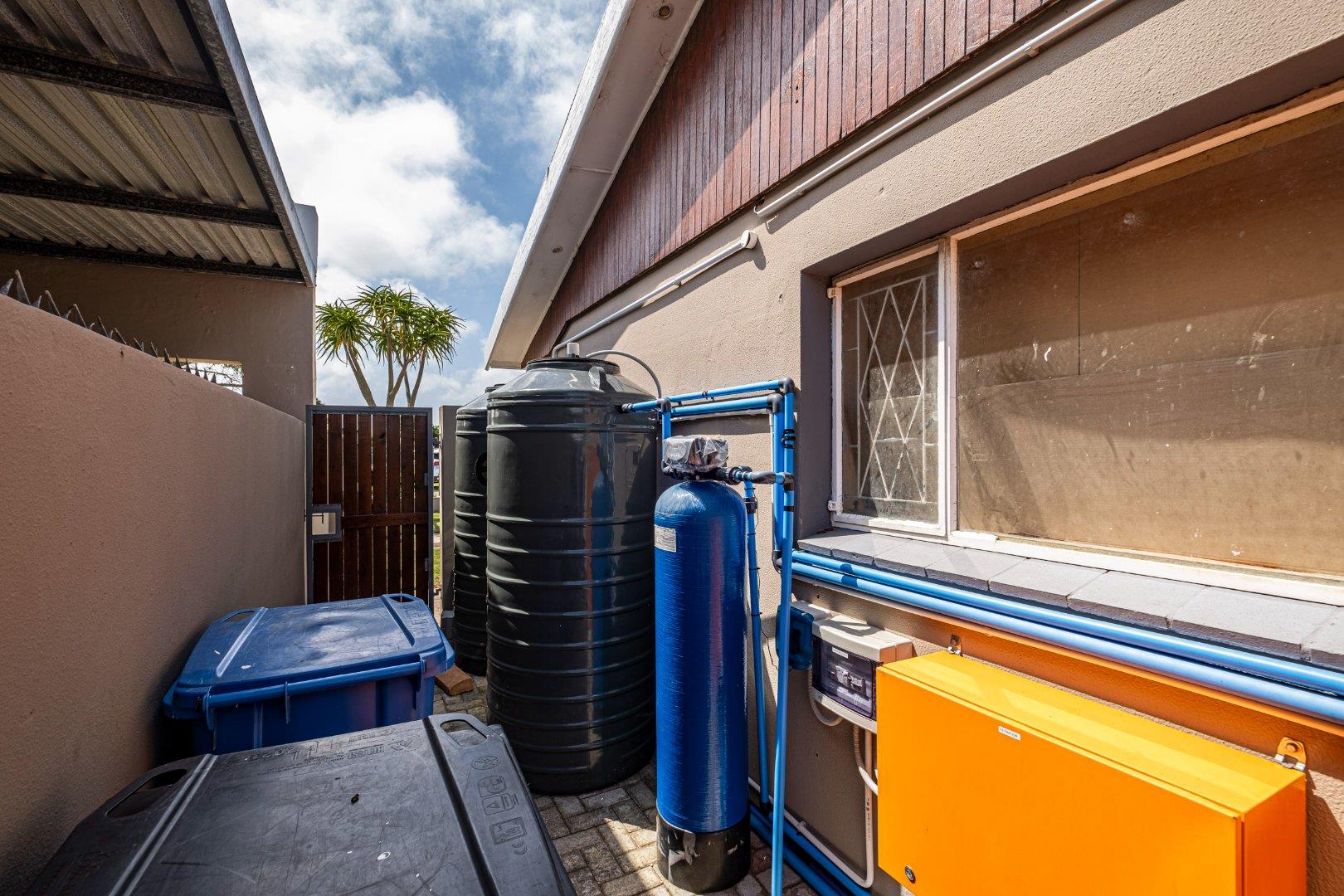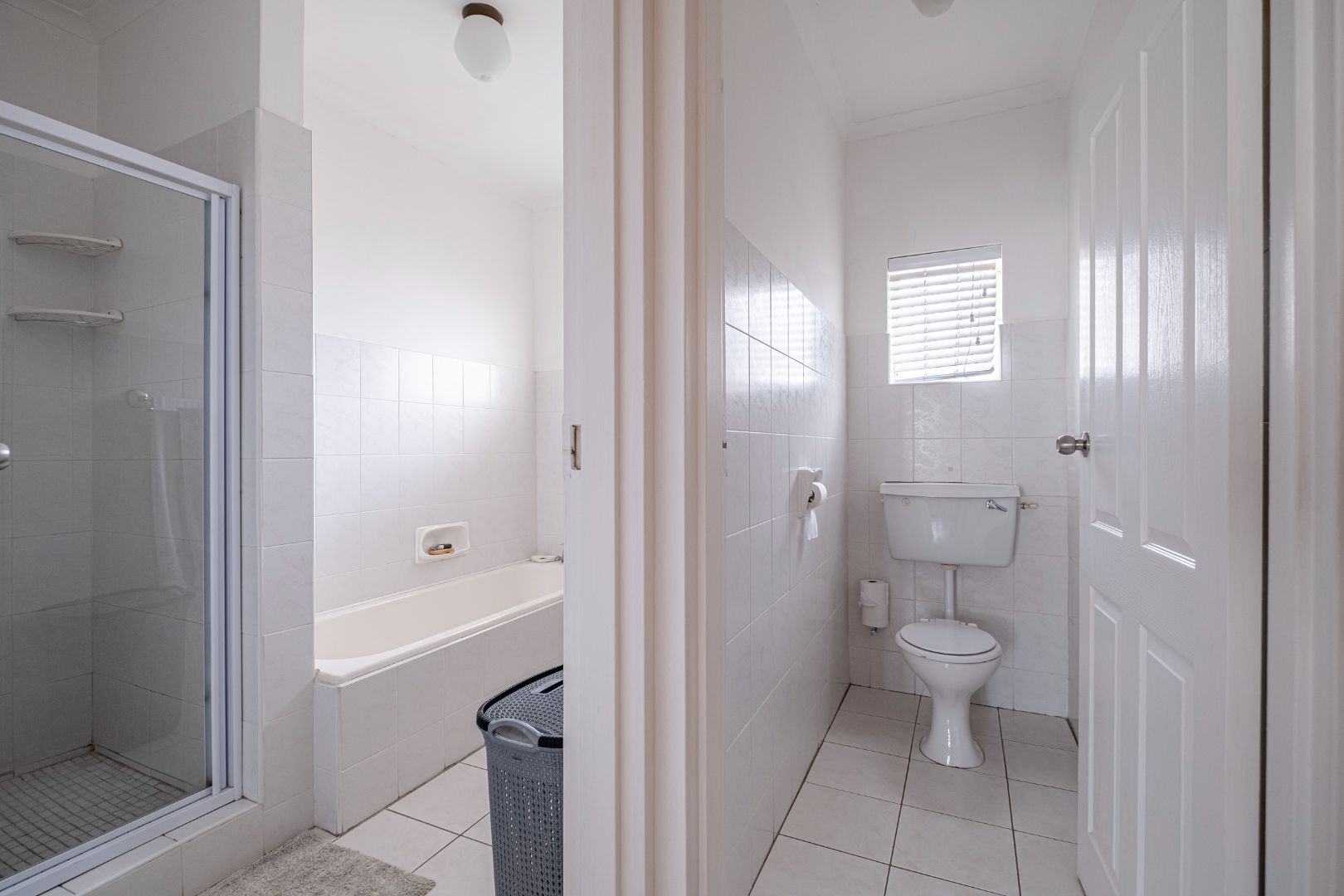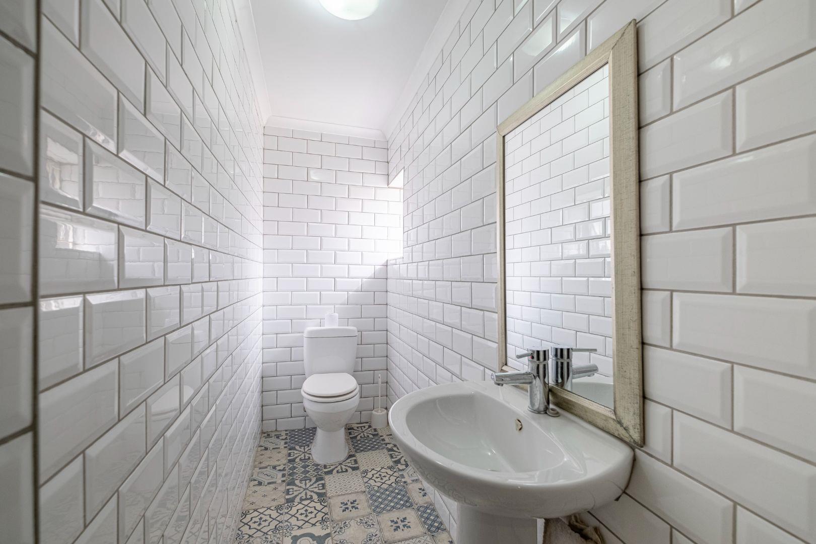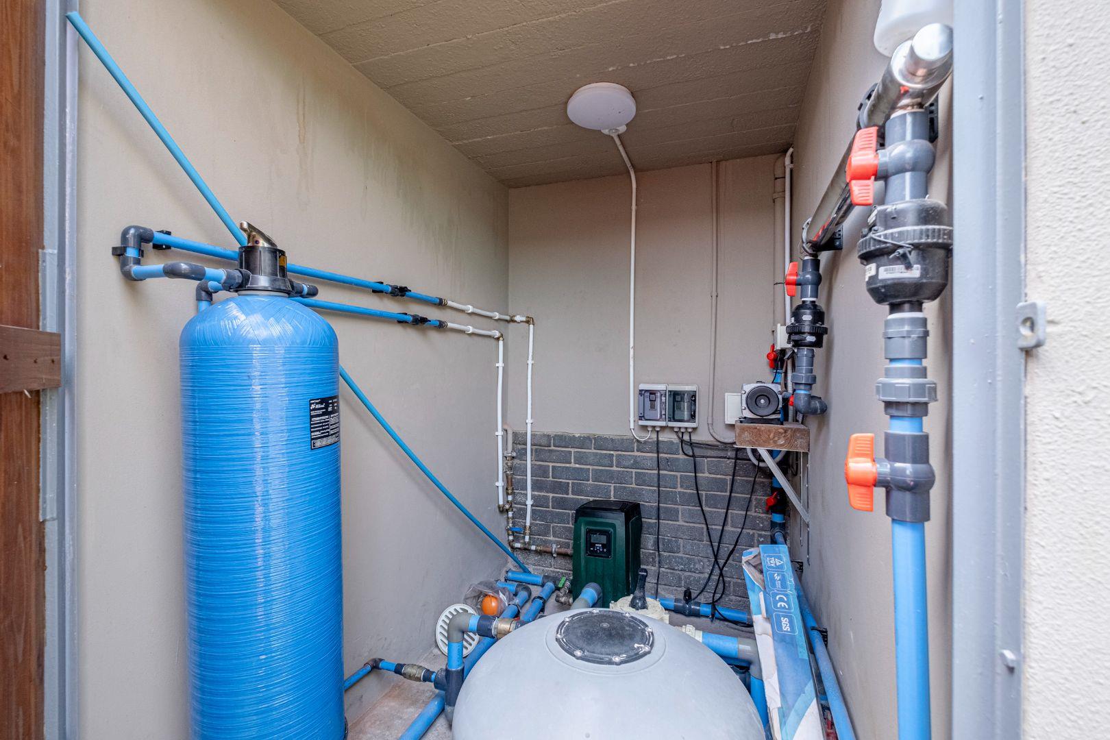 Large tiled double garage (55m2) with ample built-in cupboards, and separate powder room.