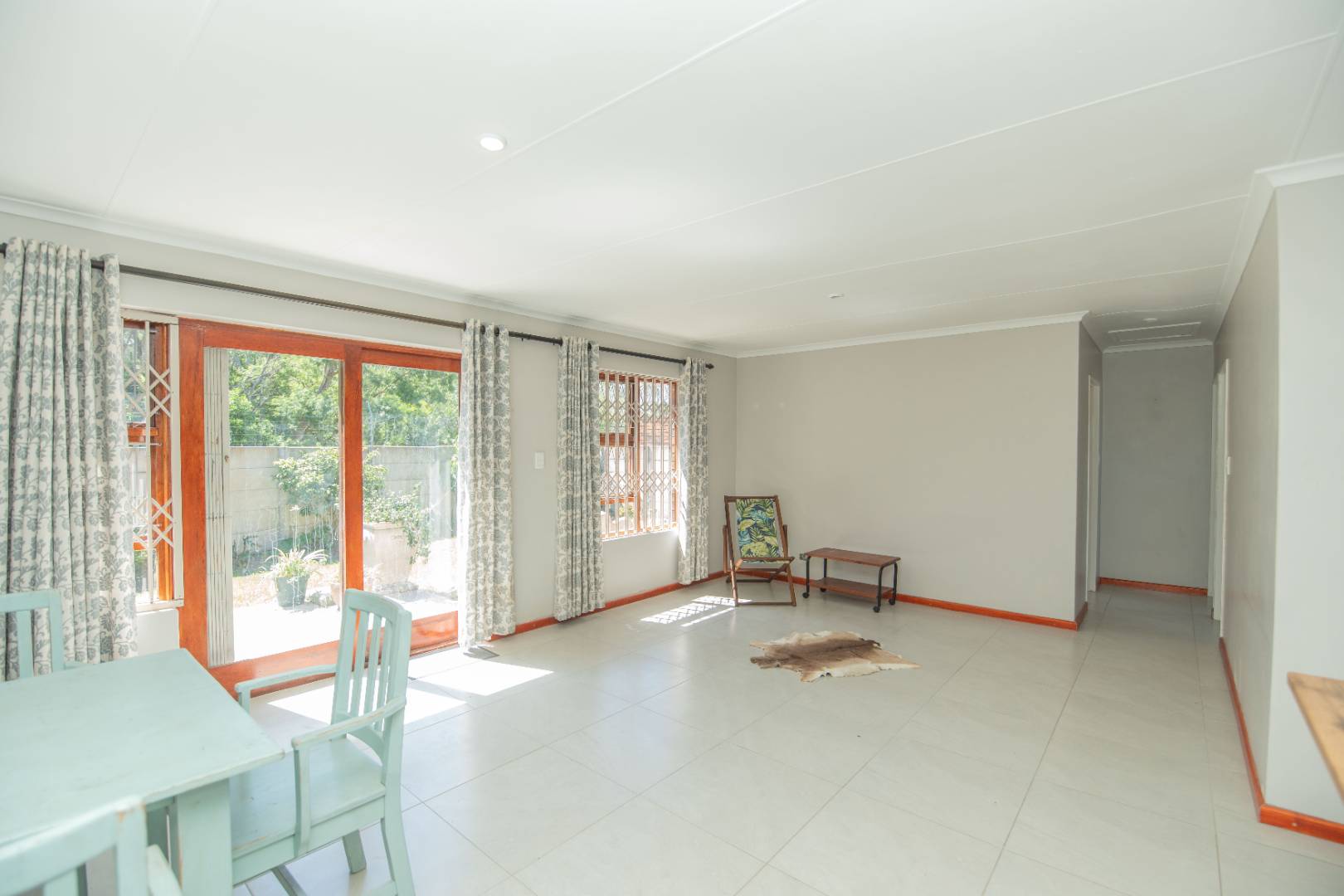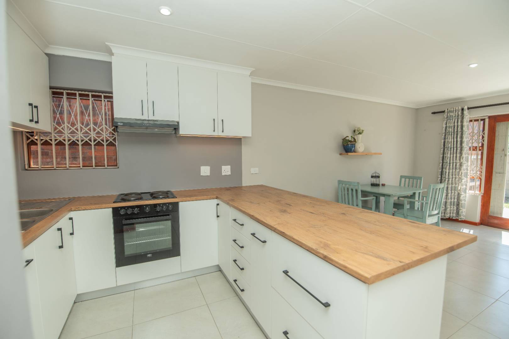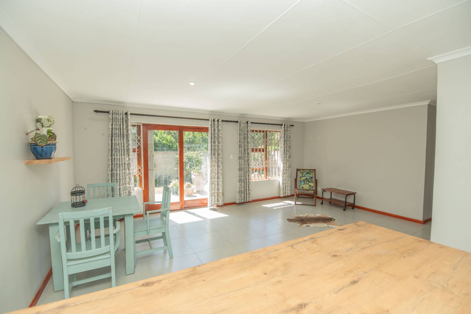 The open plan lounge, dining kitchen area is warm and inviting with the afternoon sun that streams through the windows facing the fully enclosed garden with built in braai and patio.