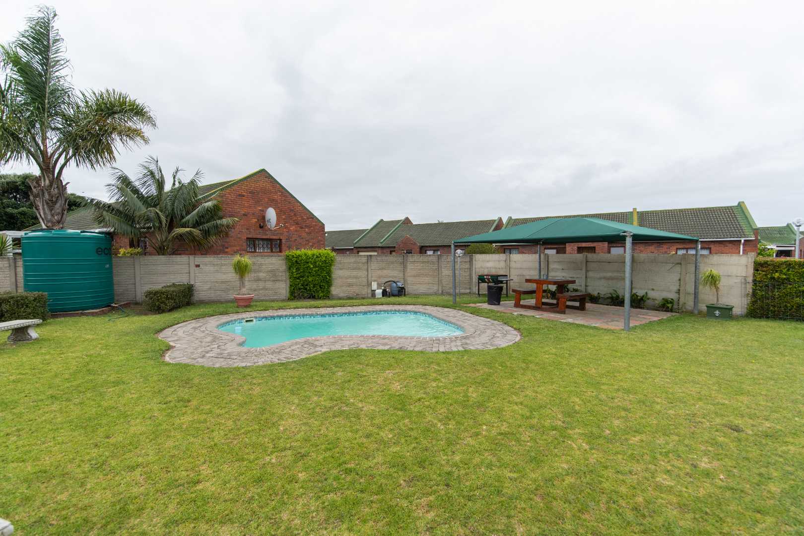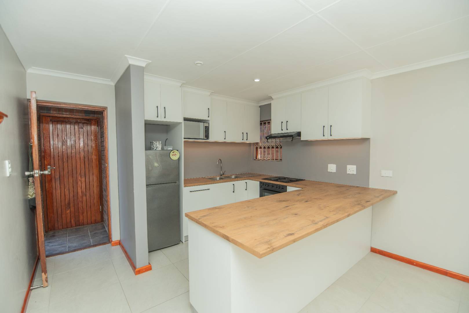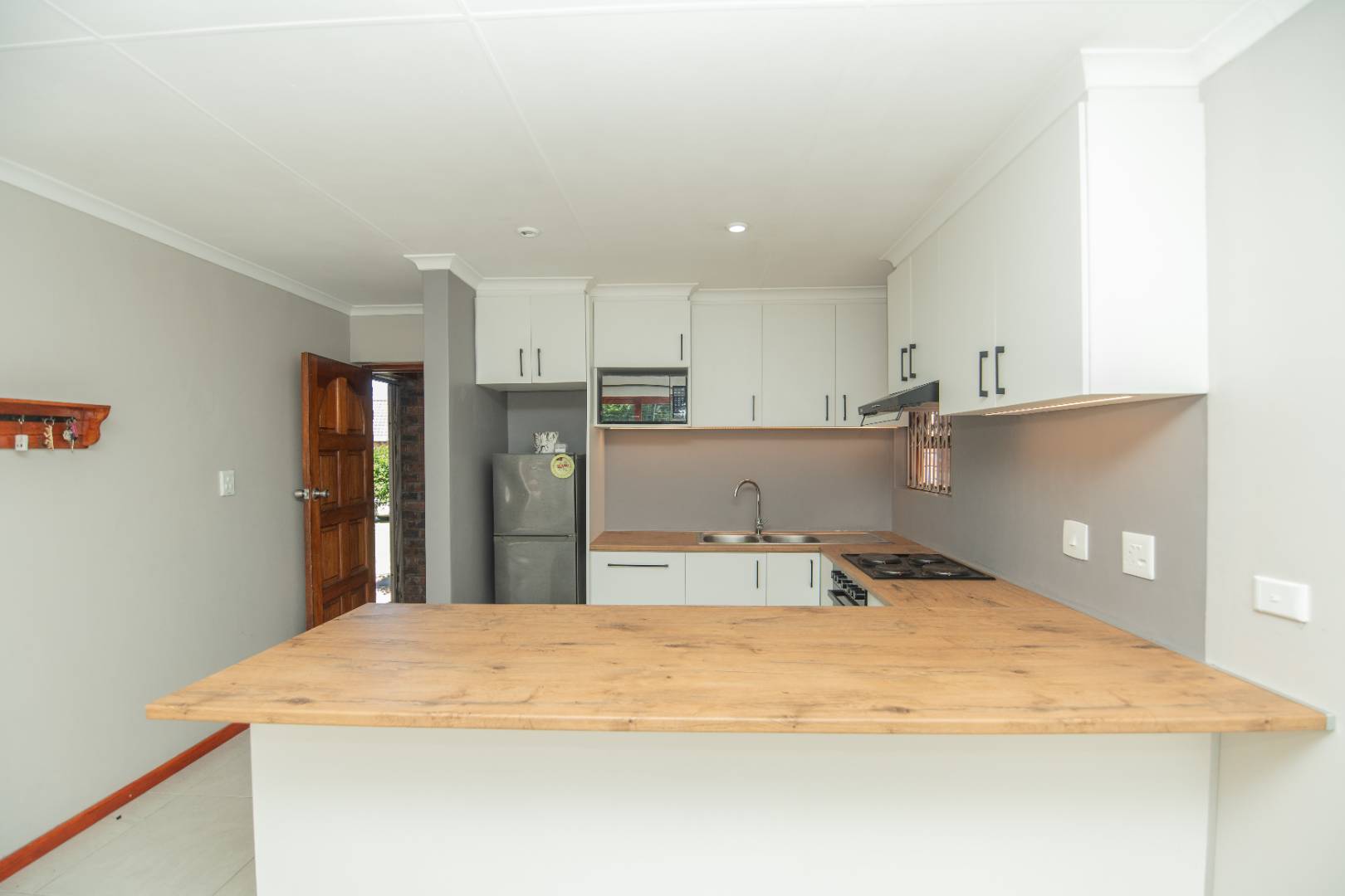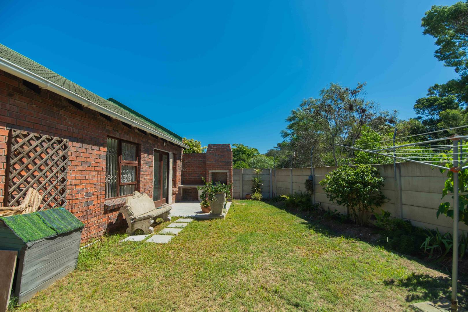 The open plan lounge, dining kitchen area is warm and inviting with the afternoon sun that streams through the windows facing the fully enclosed garden with built in braai and patio.