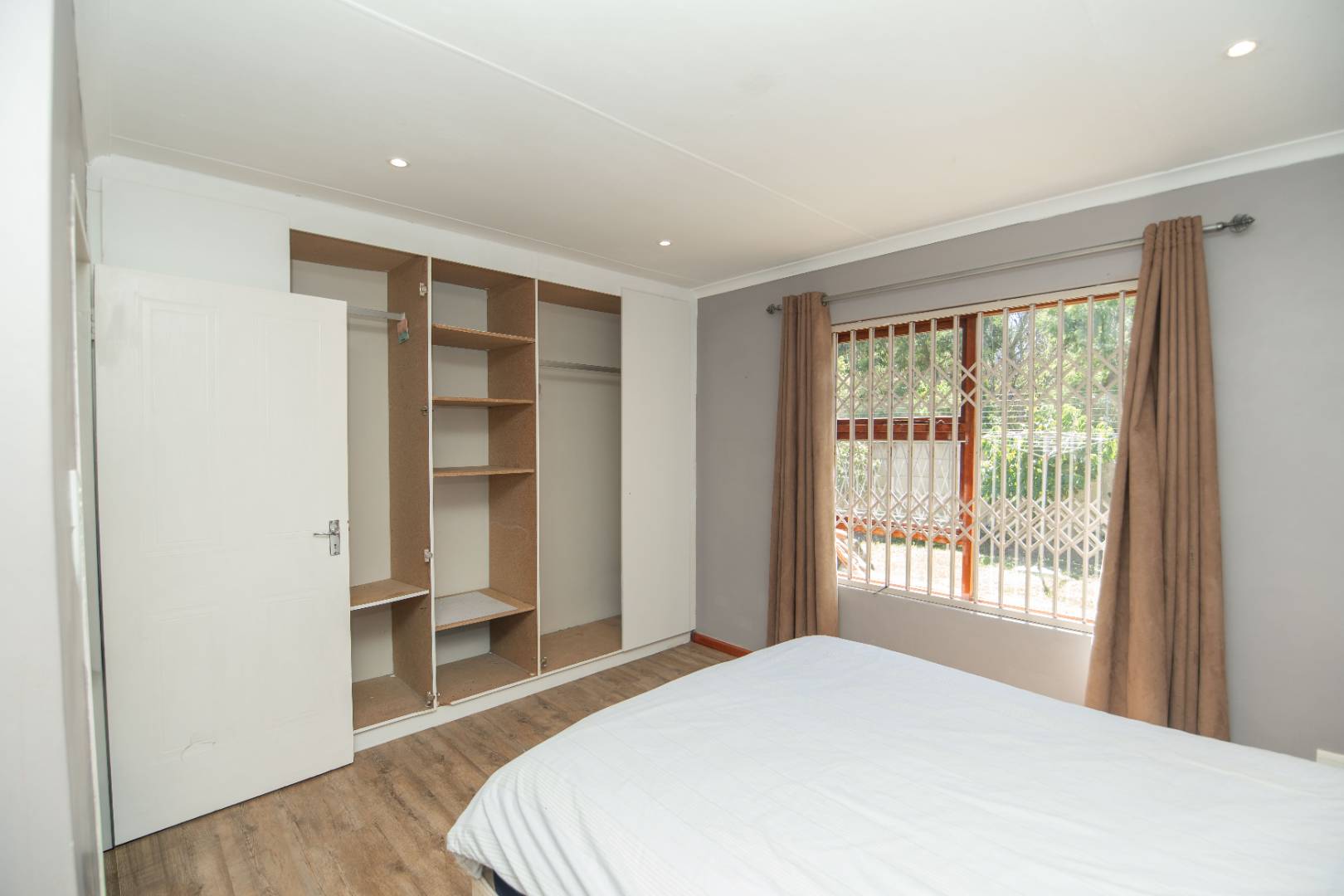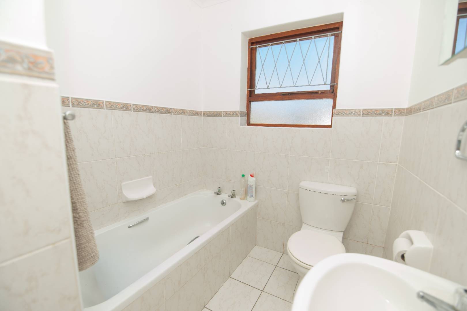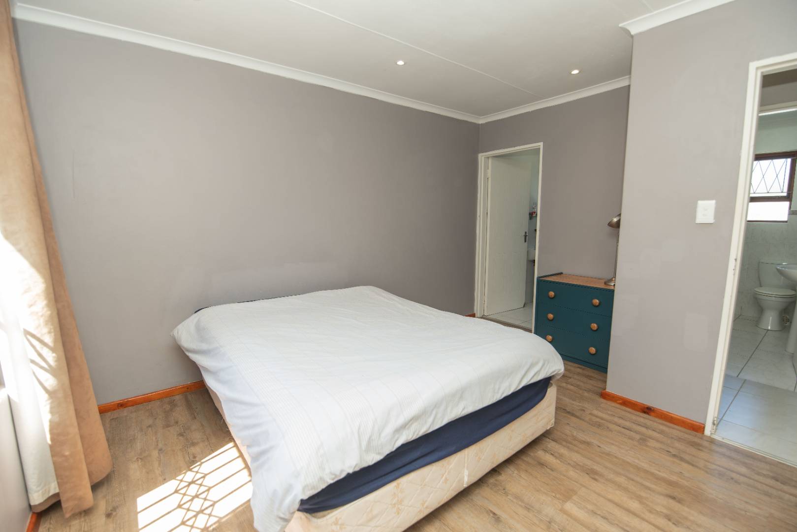 Moving down the corridor takes you to the first bedroom which has built in cupbaords and lovely flooring. The guest bathroom has a bath, basin and toilet. Moving to the spacious main bedroom, you have cupboard racks with an ensuite bathroom featuring a shower, toilet and basin.