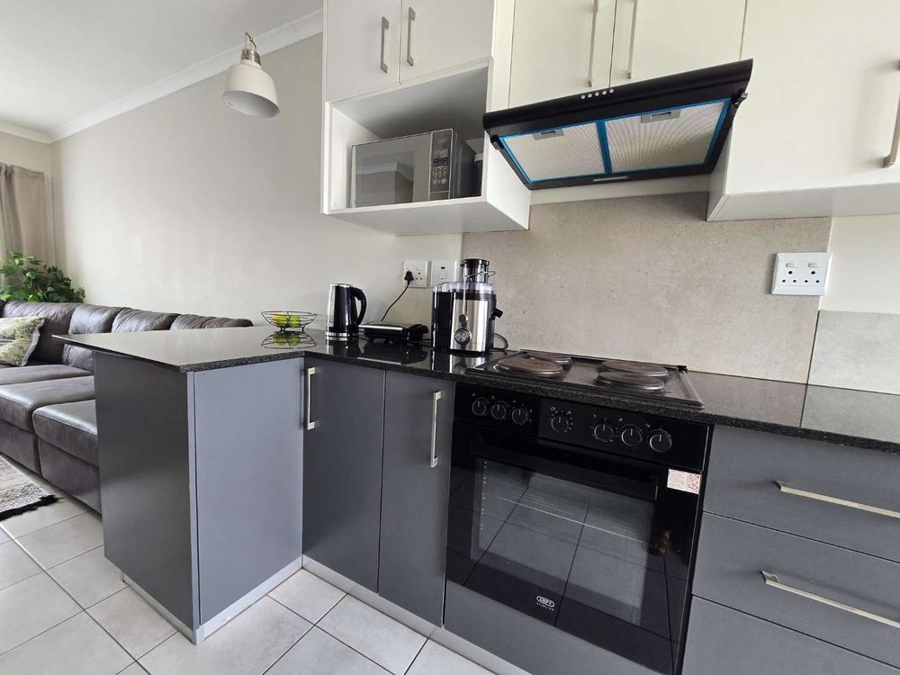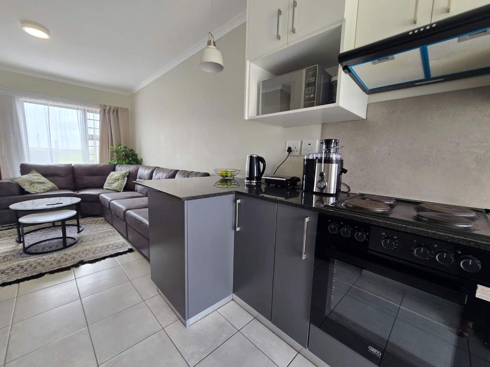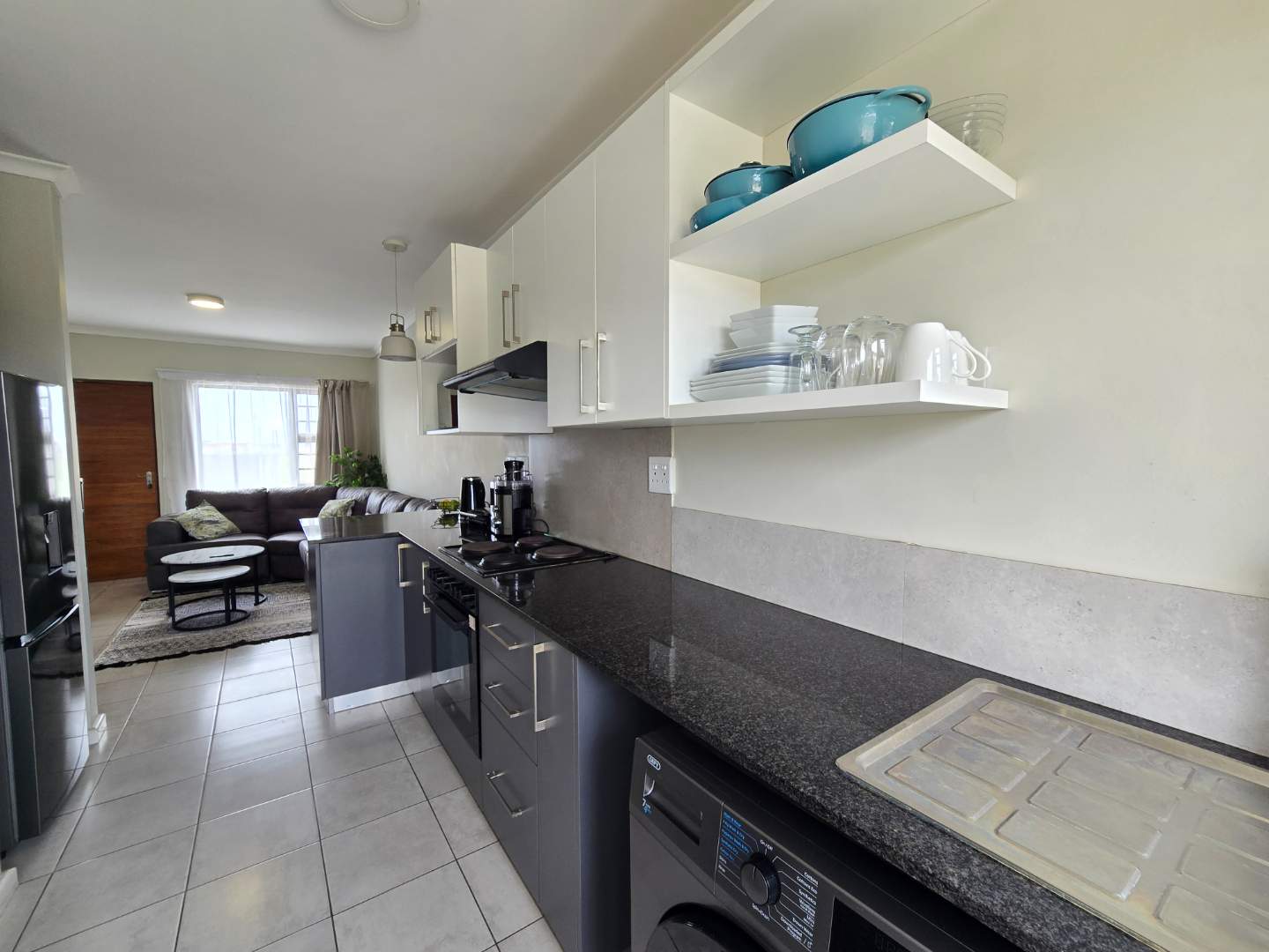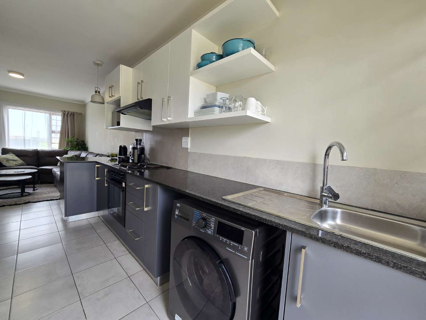 The property features a very neat and modern kitchen with a fitted stove and plumbing for a front-loader washing machine, flowing into an open-plan living area, creating a comfortable and practical living space.