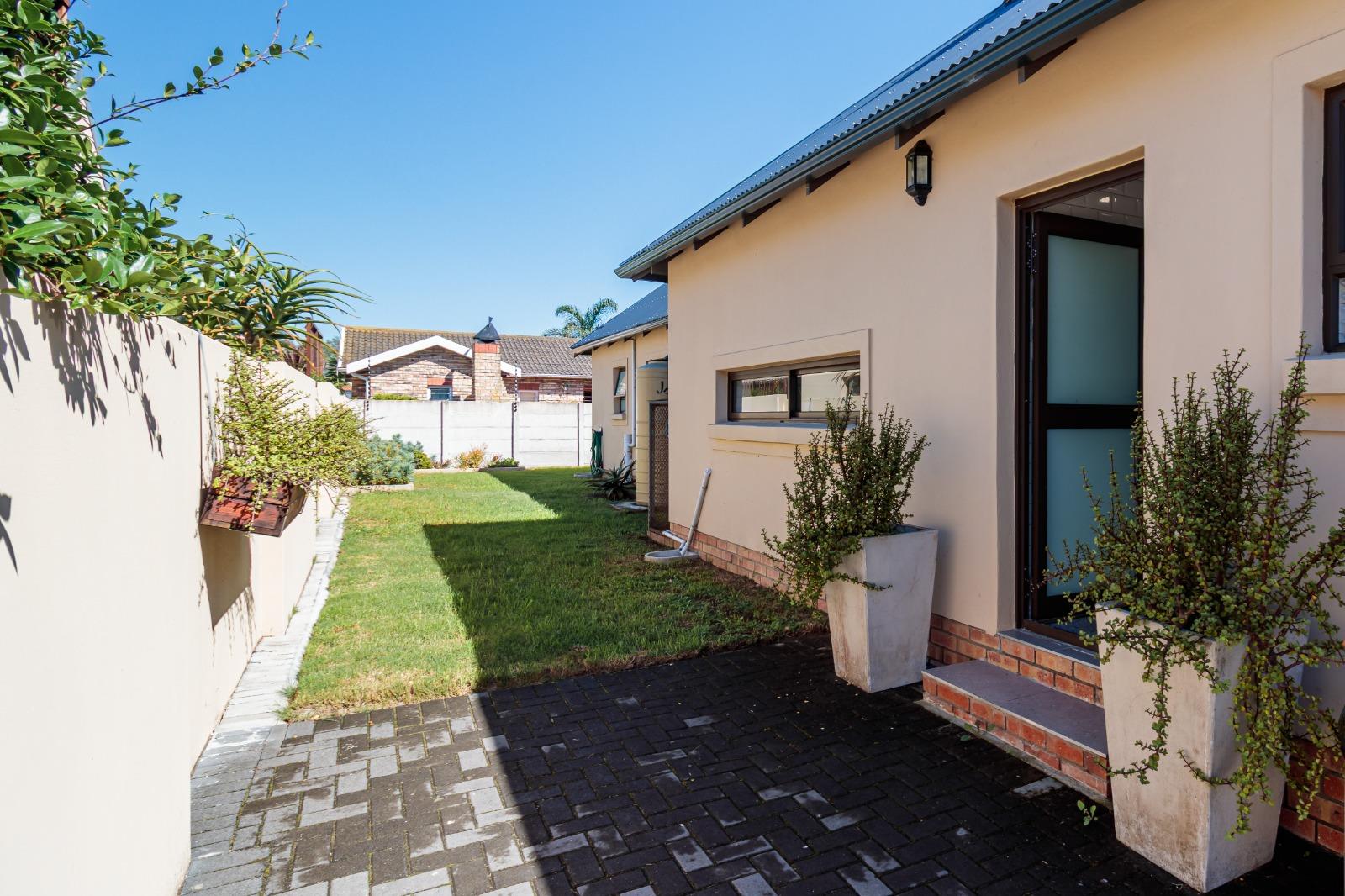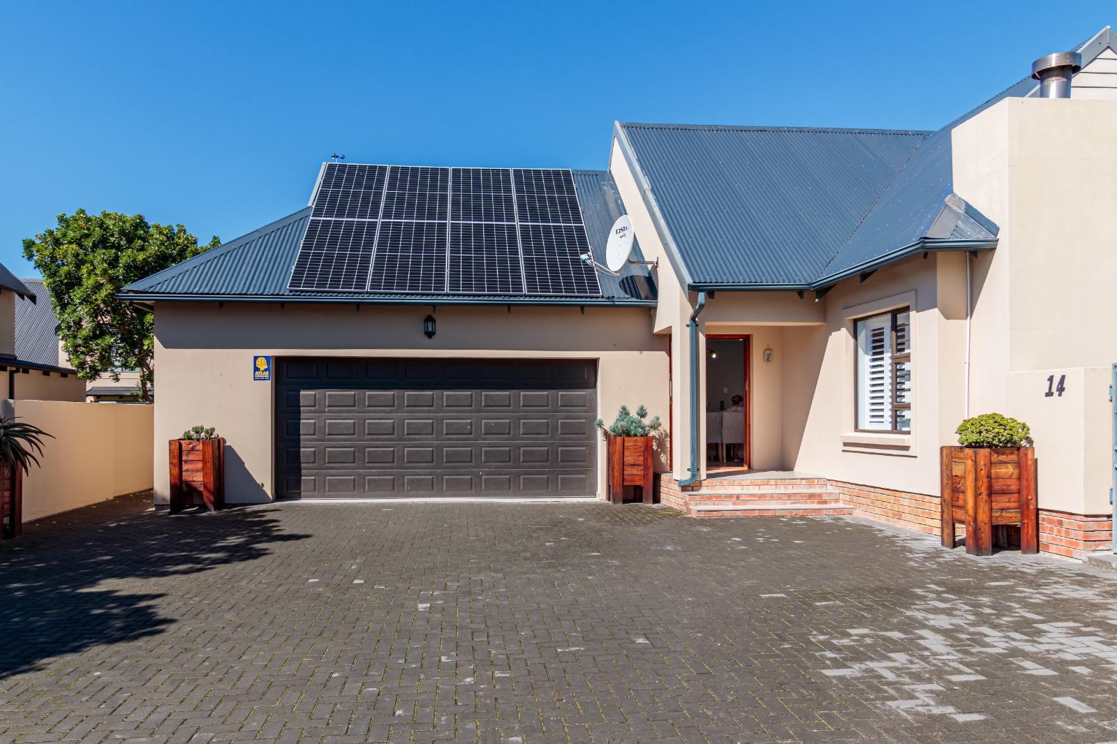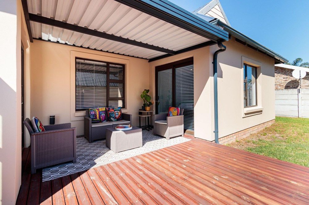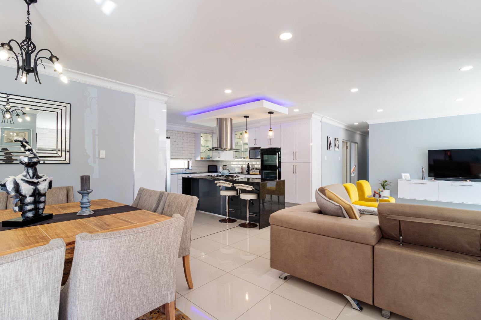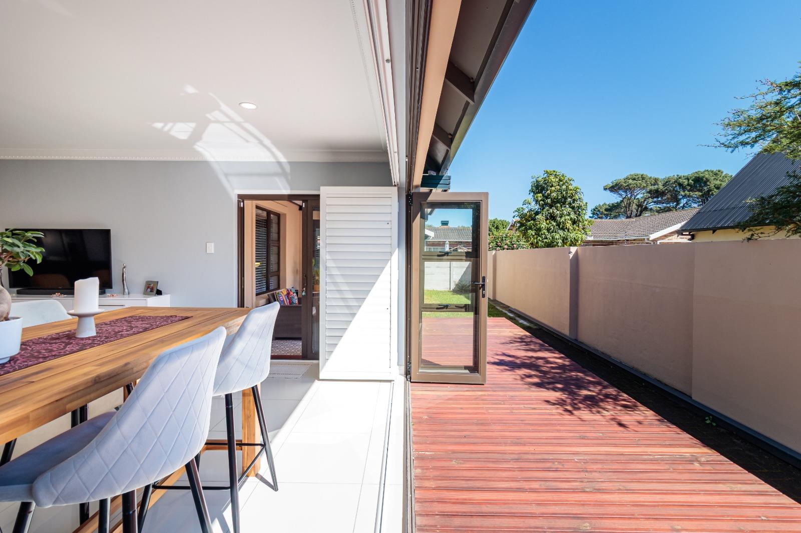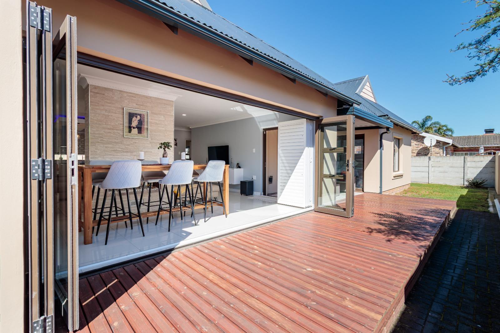 Stacking doors open onto a decked outdoor lounge area and garden, creating an effortless indoor-outdoor flow. The entertainment area is complemented by a built-in braai, perfect for hosting.