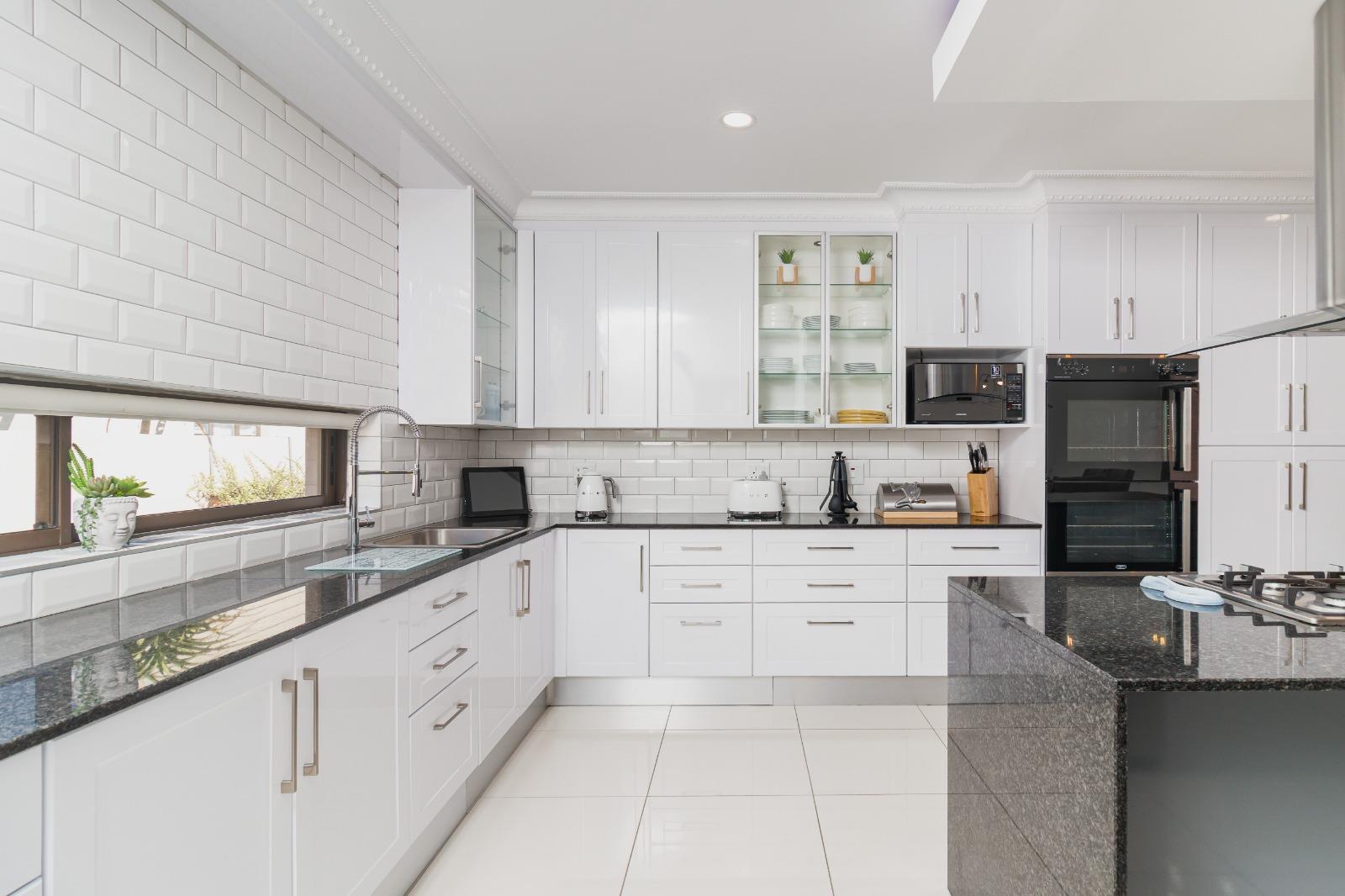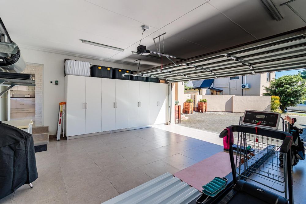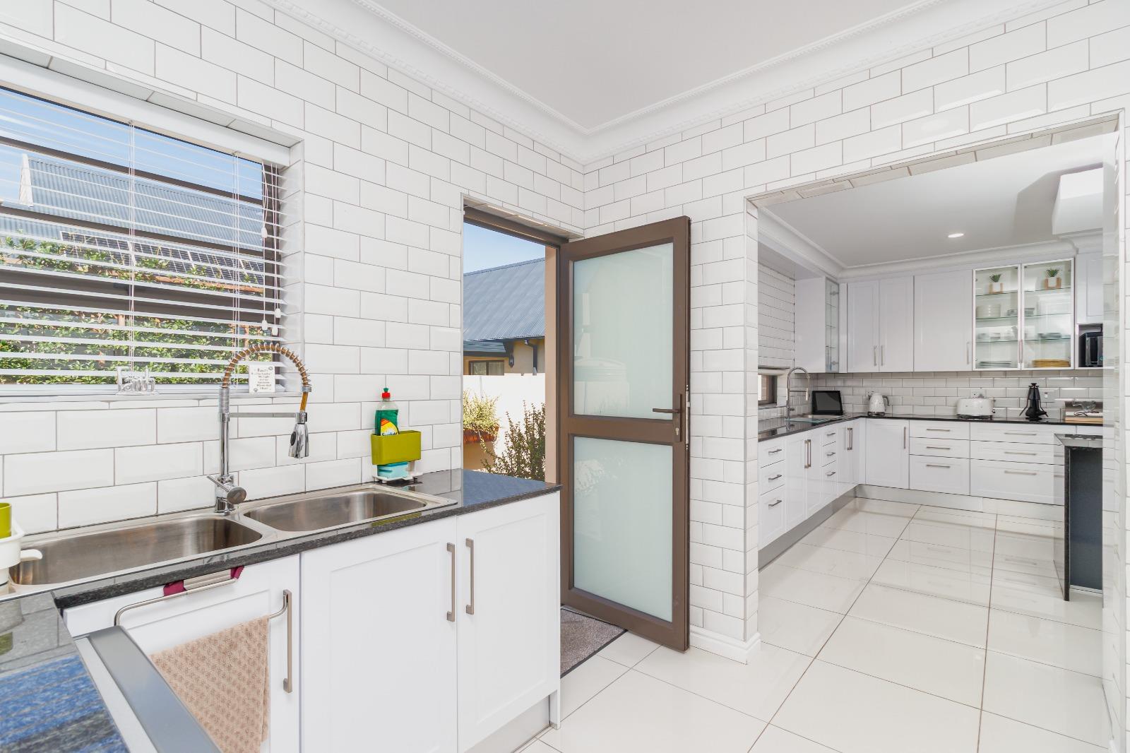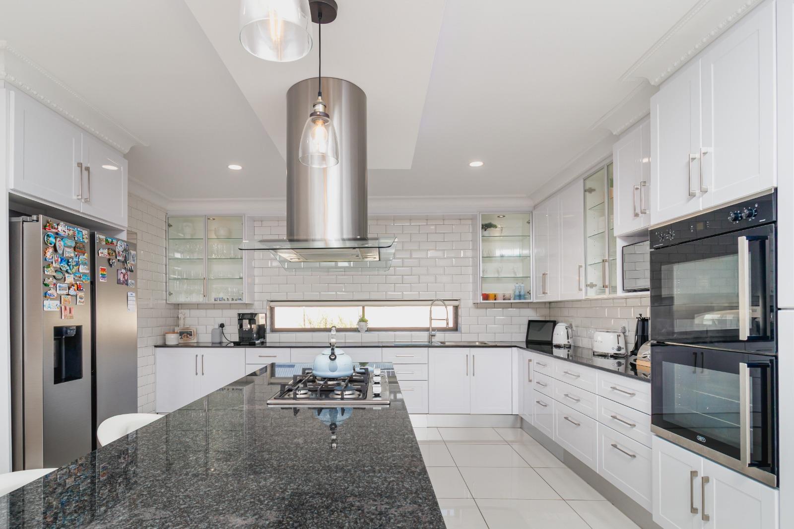 The contemporary kitchen is beautifully finished with stylish lighting and includes a separate scullery that leads directly into a spacious double garage, complete with built-in cupboards for ample storage.