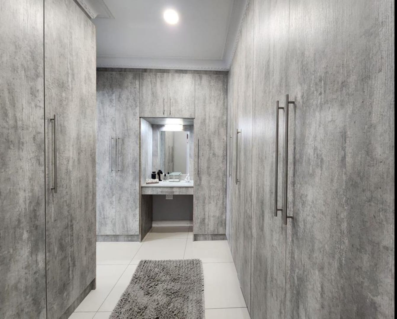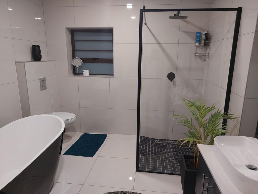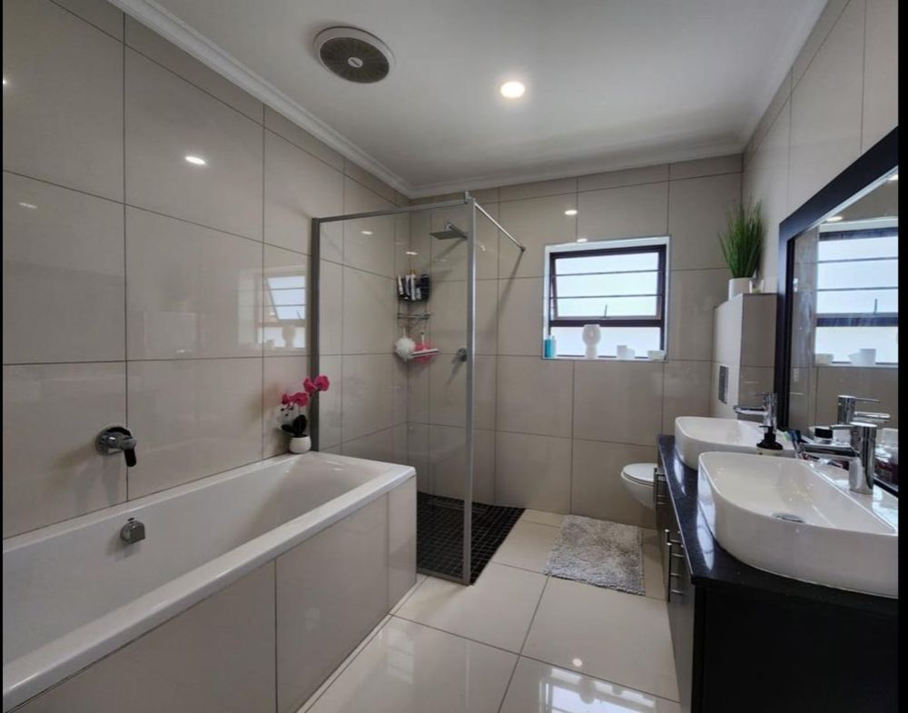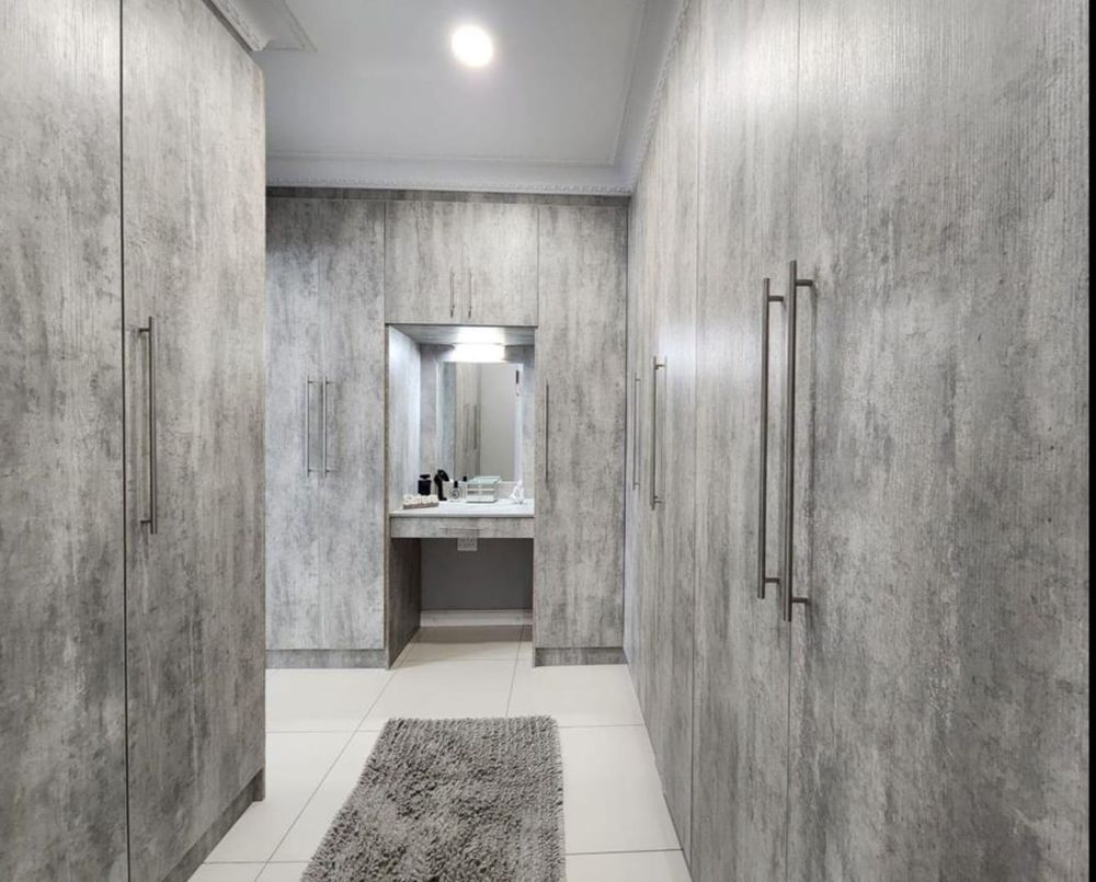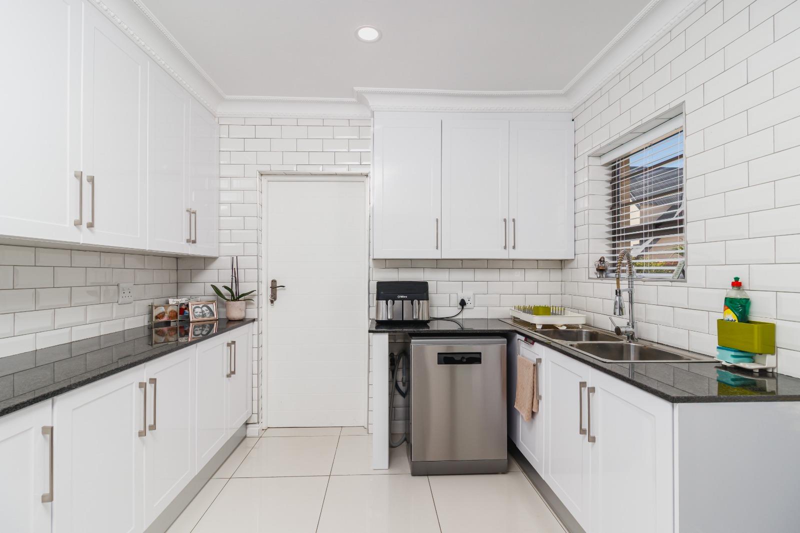 The contemporary kitchen is beautifully finished with stylish lighting and includes a separate scullery that leads directly into a spacious double garage, complete with built-in cupboards for ample storage.