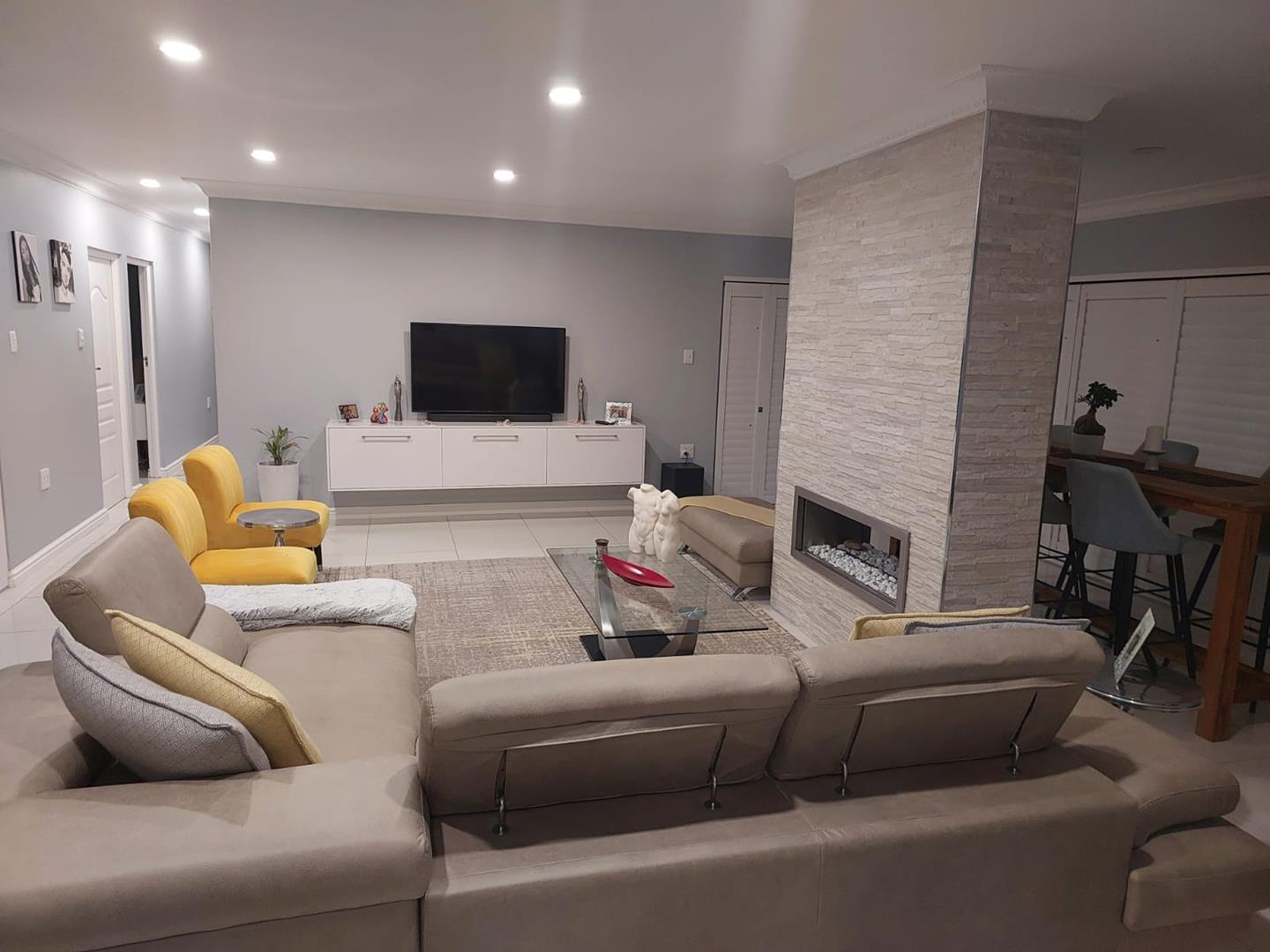 The heart of the home is the open-plan living area, seamlessly connecting the lounge, dining room, kitchen, and entertainment space. A striking modern gas stone fireplace creates a warm focal point in the lounge, which also includes a sleek built-in TV unit.