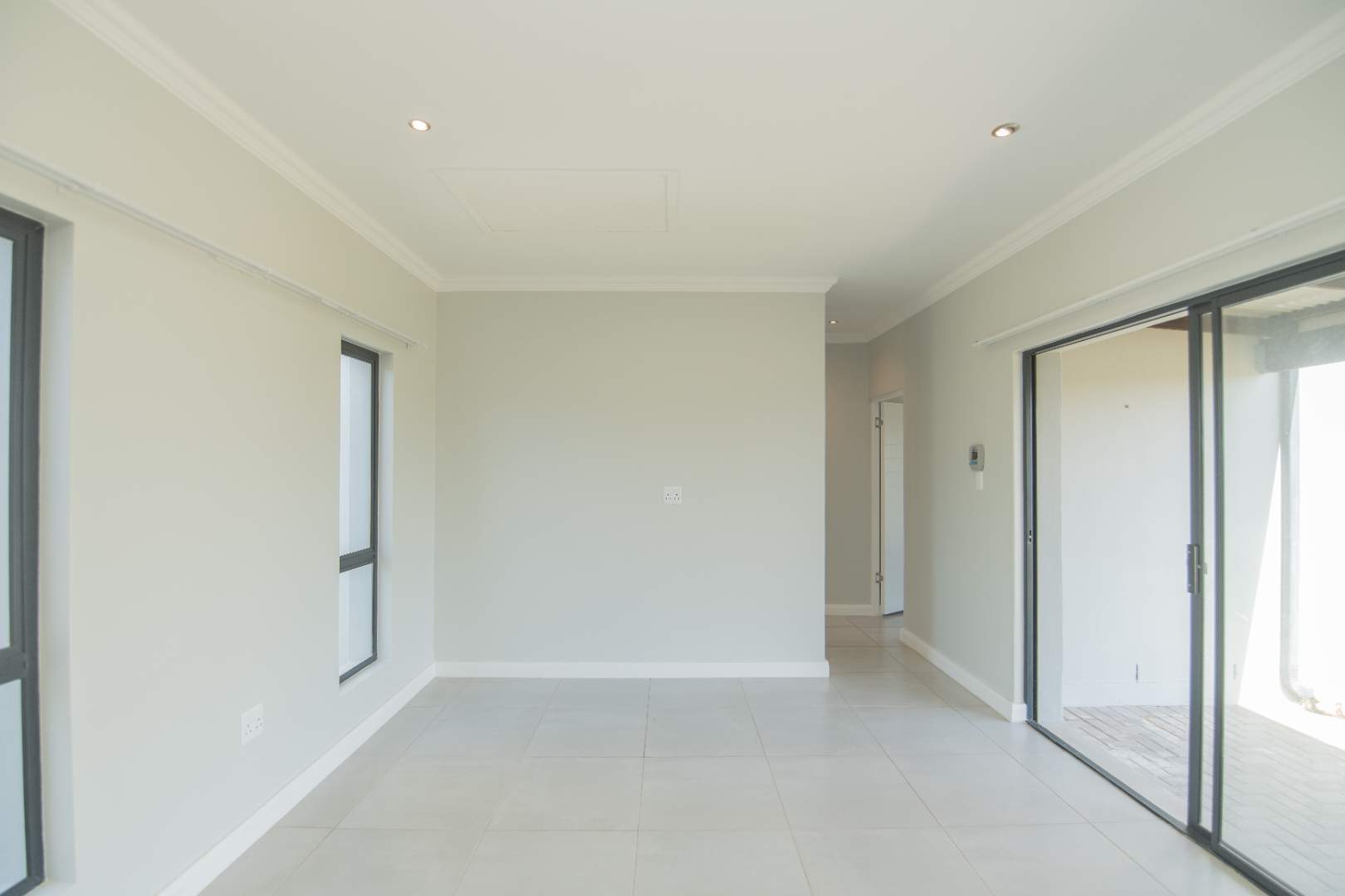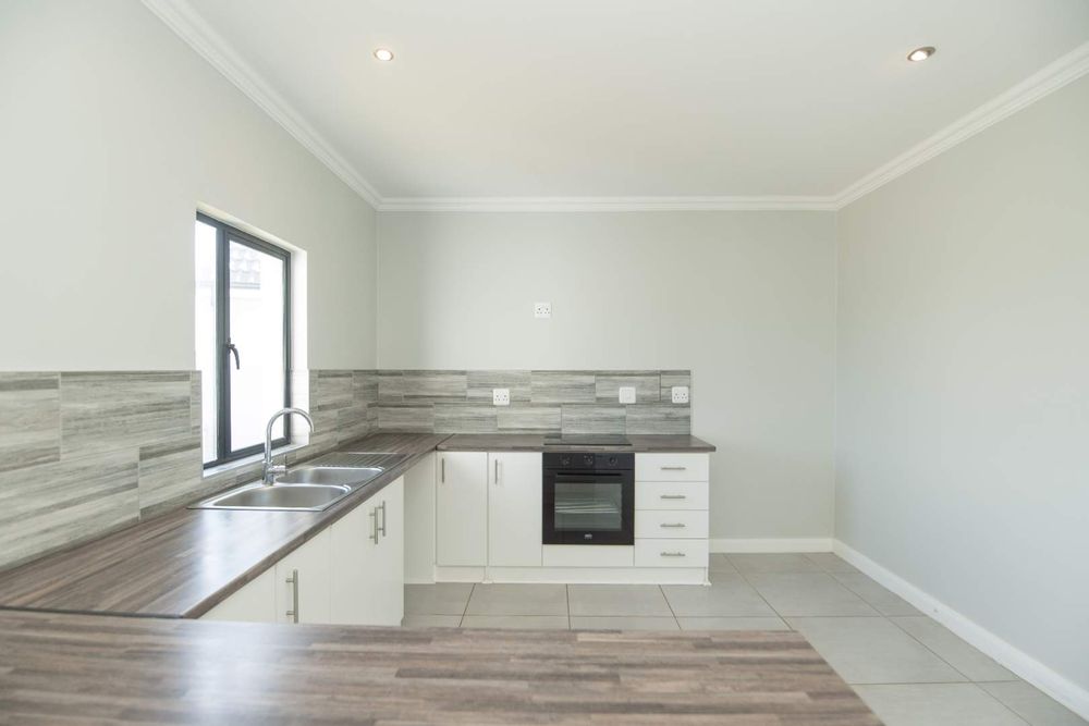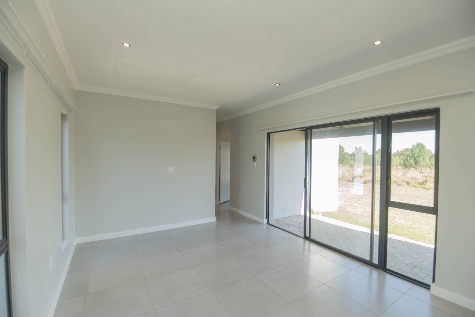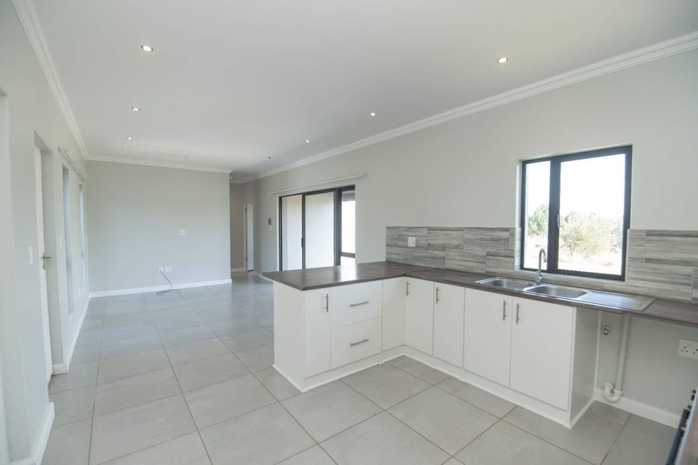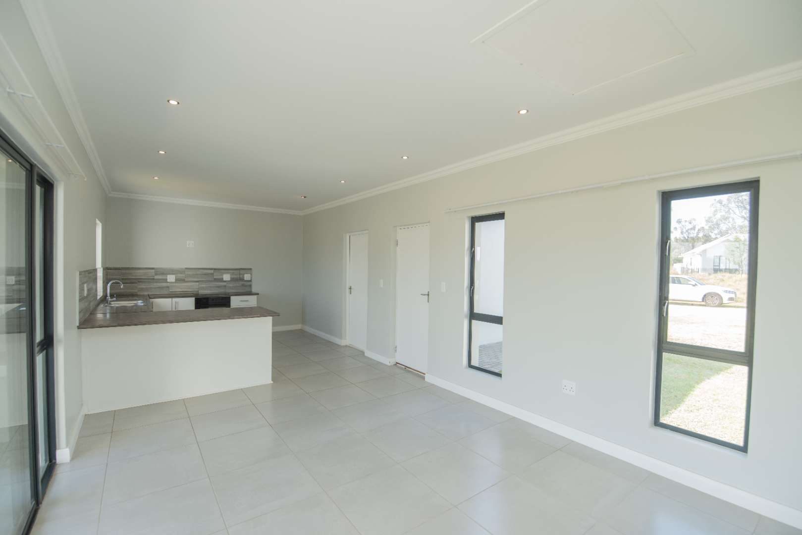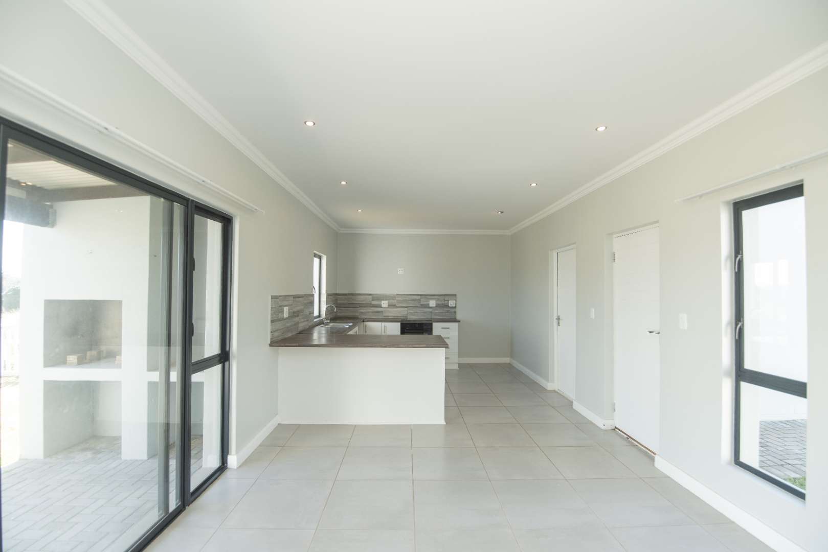 Fully tiled, open-plan lounge and kitchen, with the lounge flowing onto a private patio with built-in braai — ideal for relaxing or entertaining